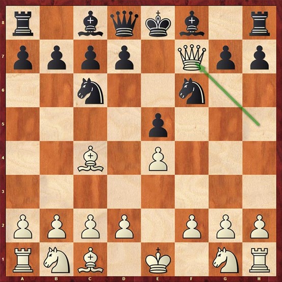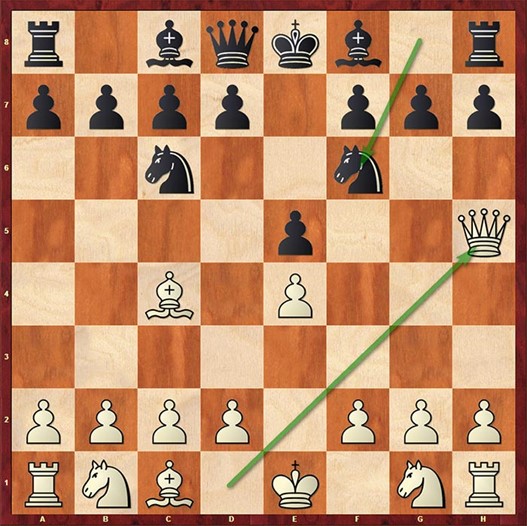 3 ход. Белые ставят ферзя на h5!!! Здесь черные должны правильно сыграть, потому что им угрожает мат на f7 ферзем.