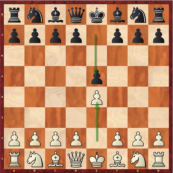 1 ход. Белые ходят e4, черные отвечают e5. Стандартное начало в шахматах. Белые и черные сделали хорошие ходы.