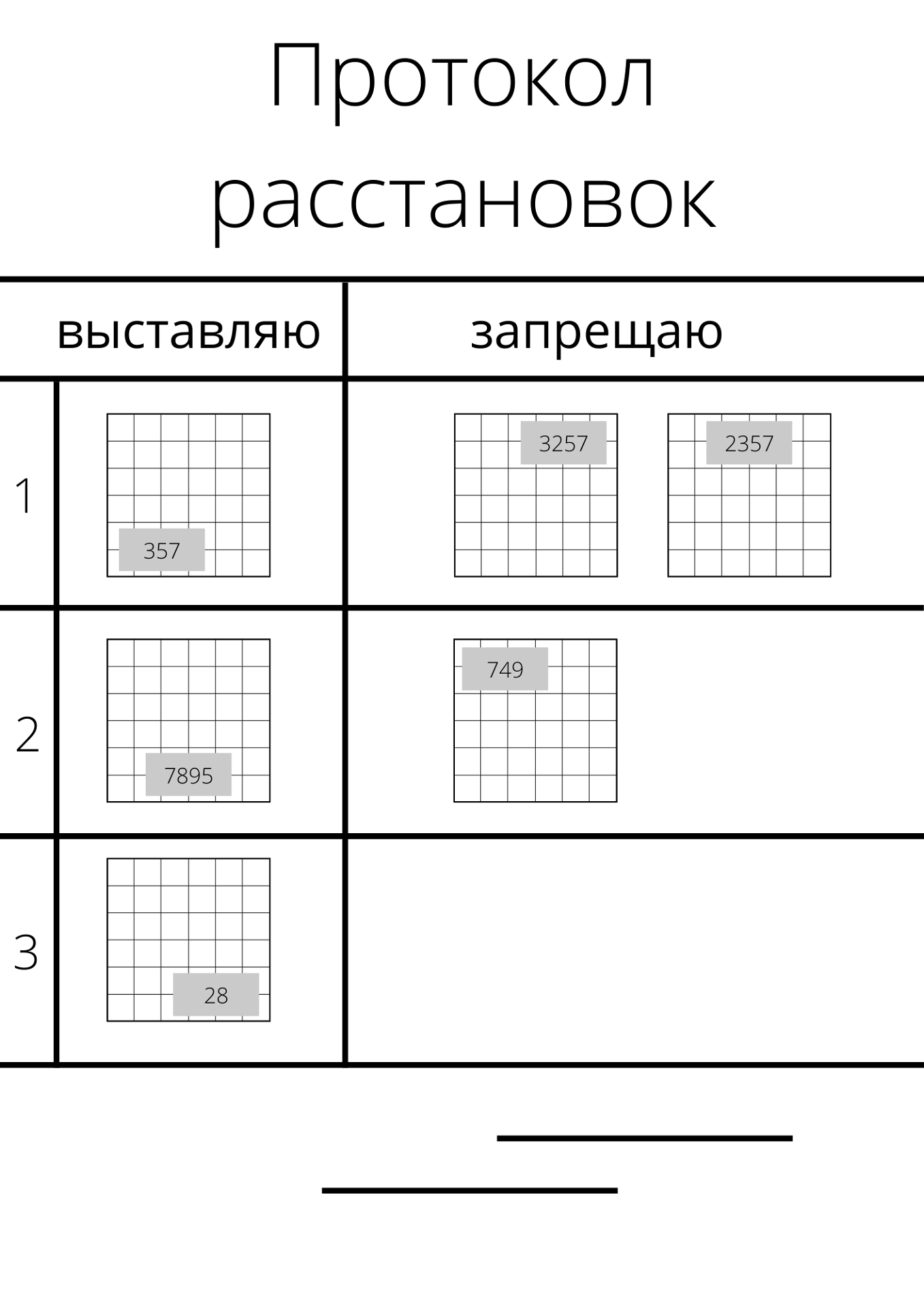 Перед расстановкой каждый игрок заполняет протокол, в котором определяет 2 списка: